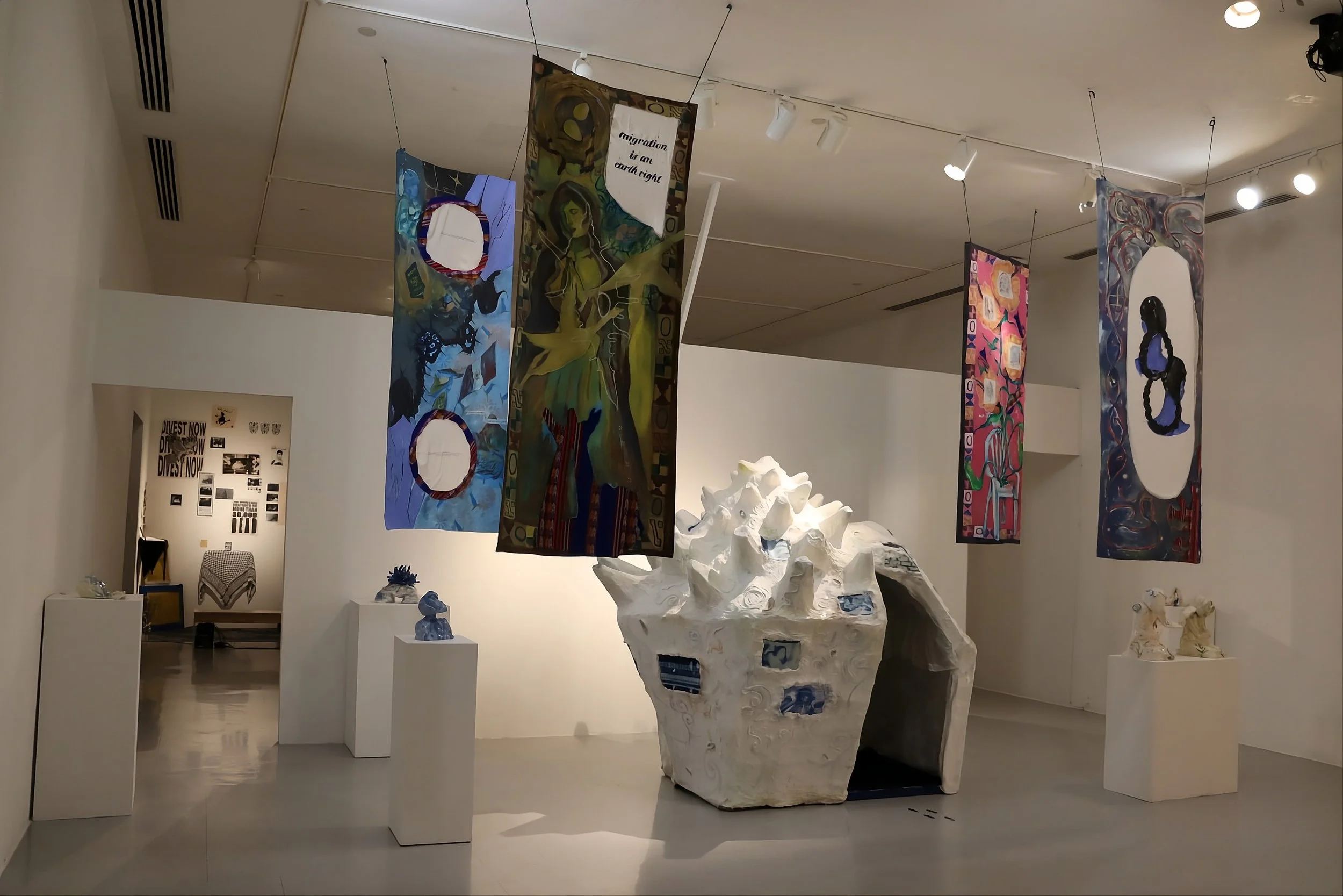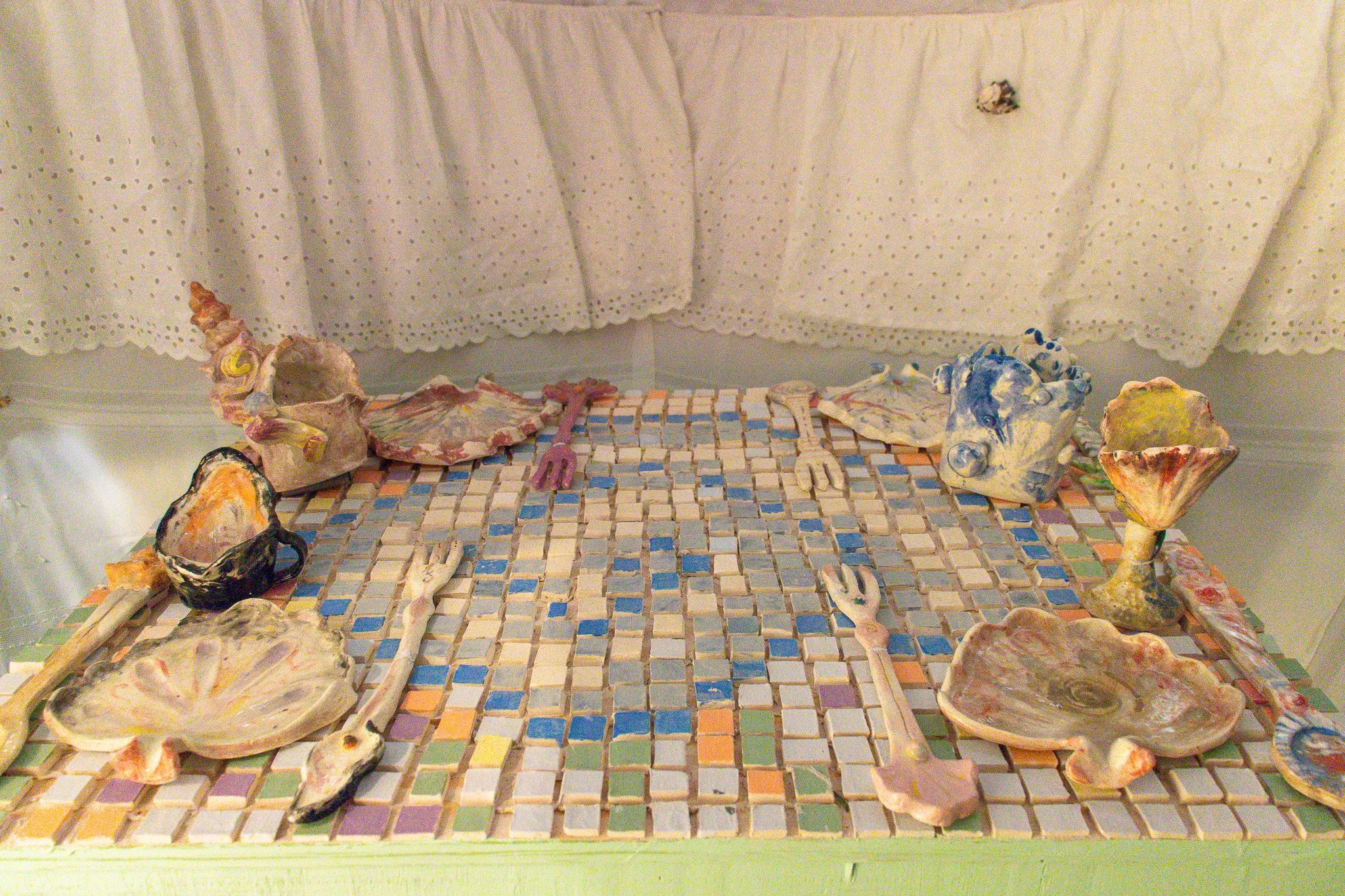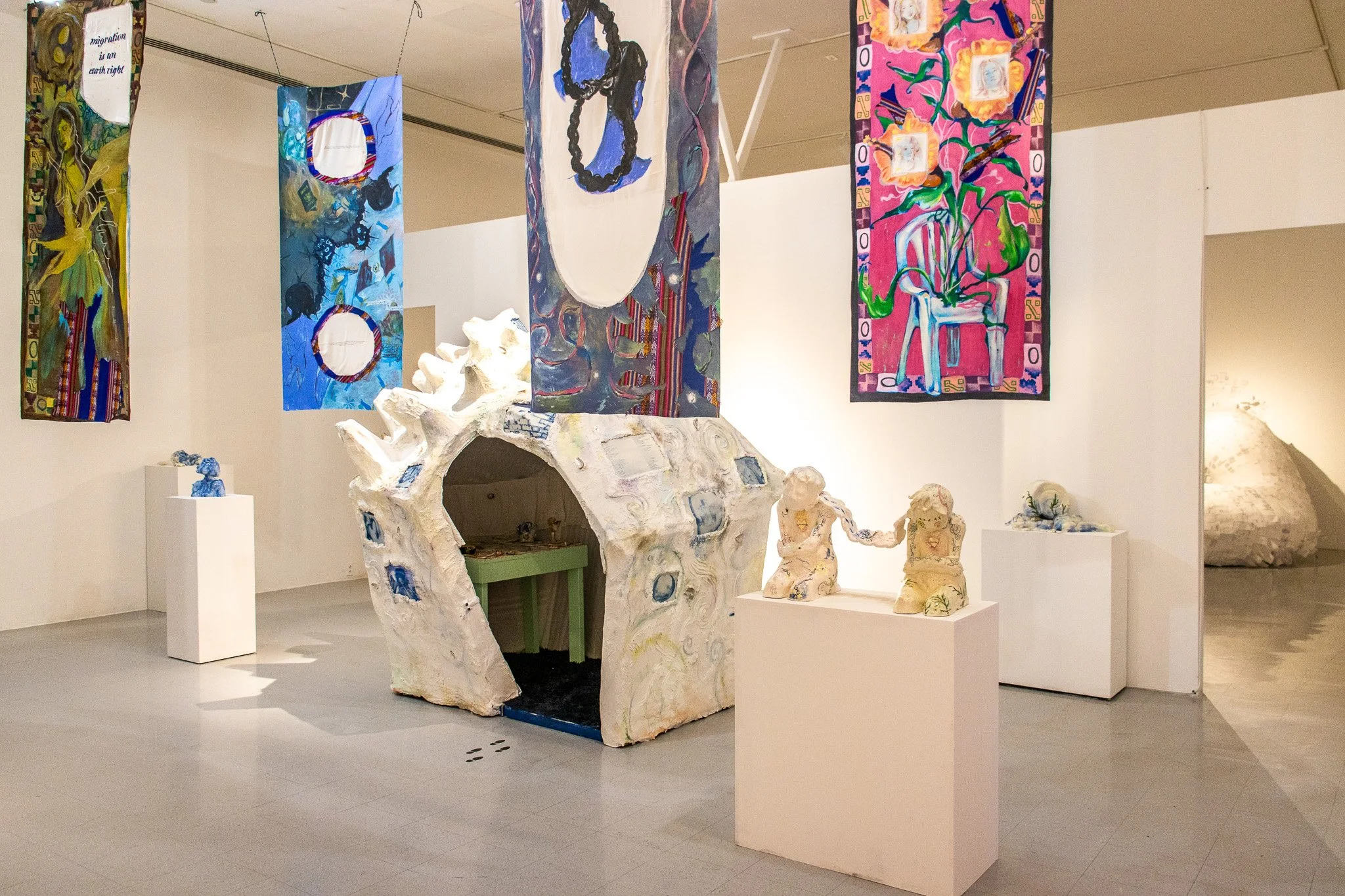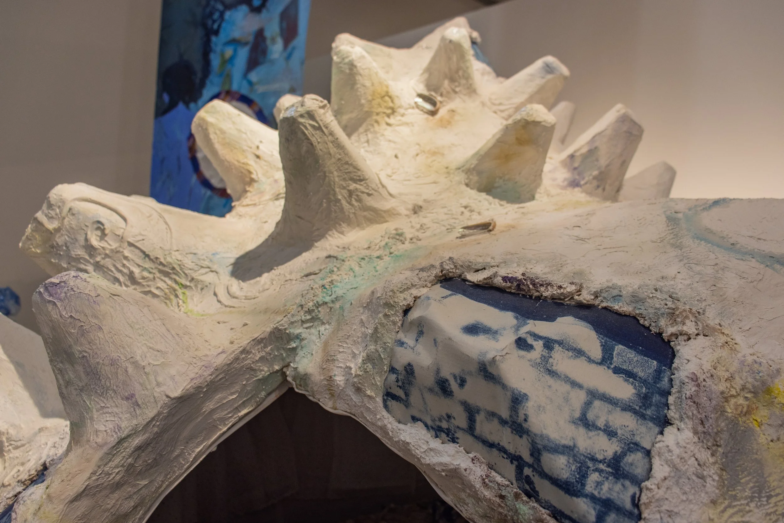 Paper Mache, Wood, Ceramics, Oil Paint, Arduino, Cyanotypes, and Textile